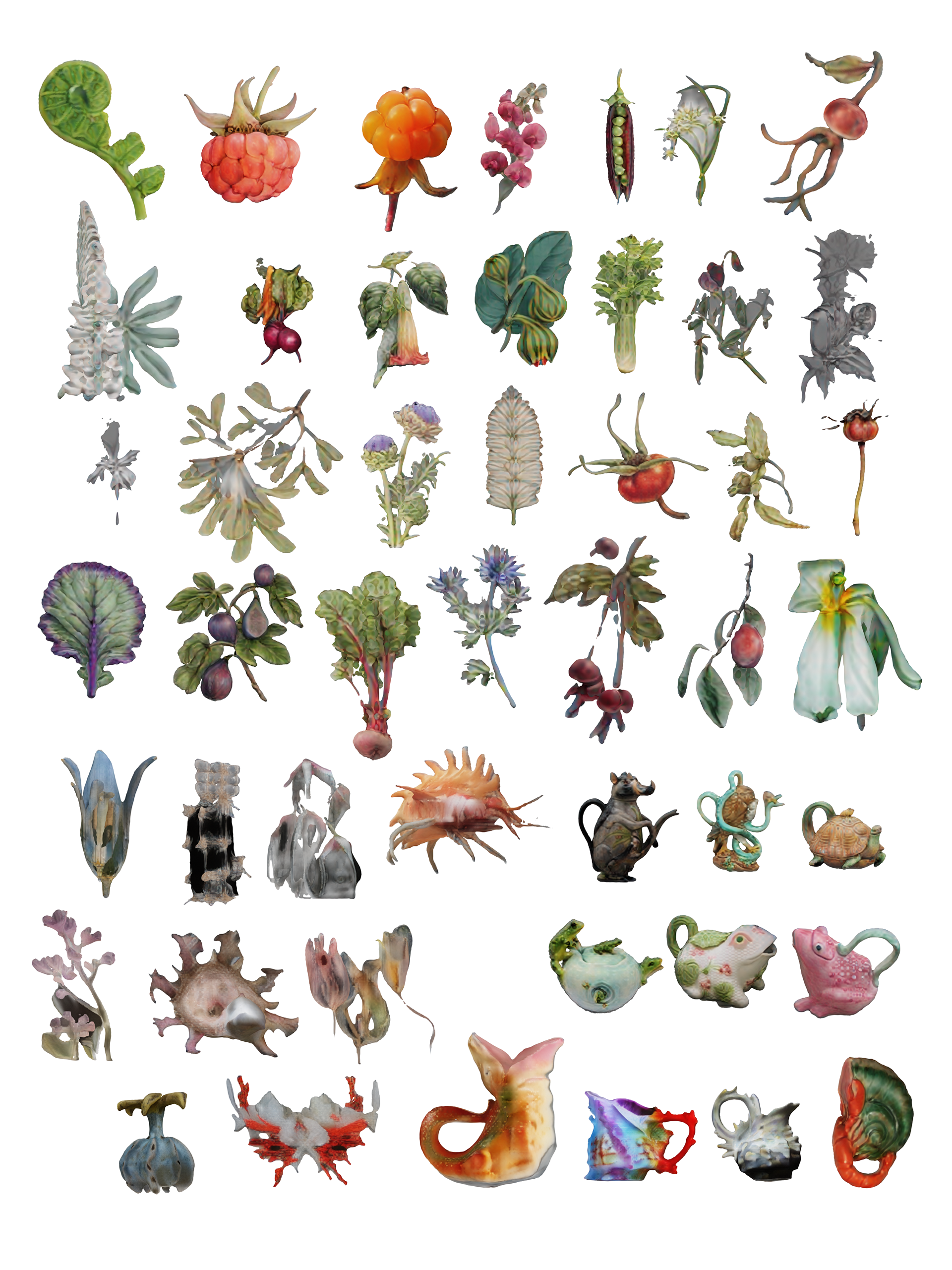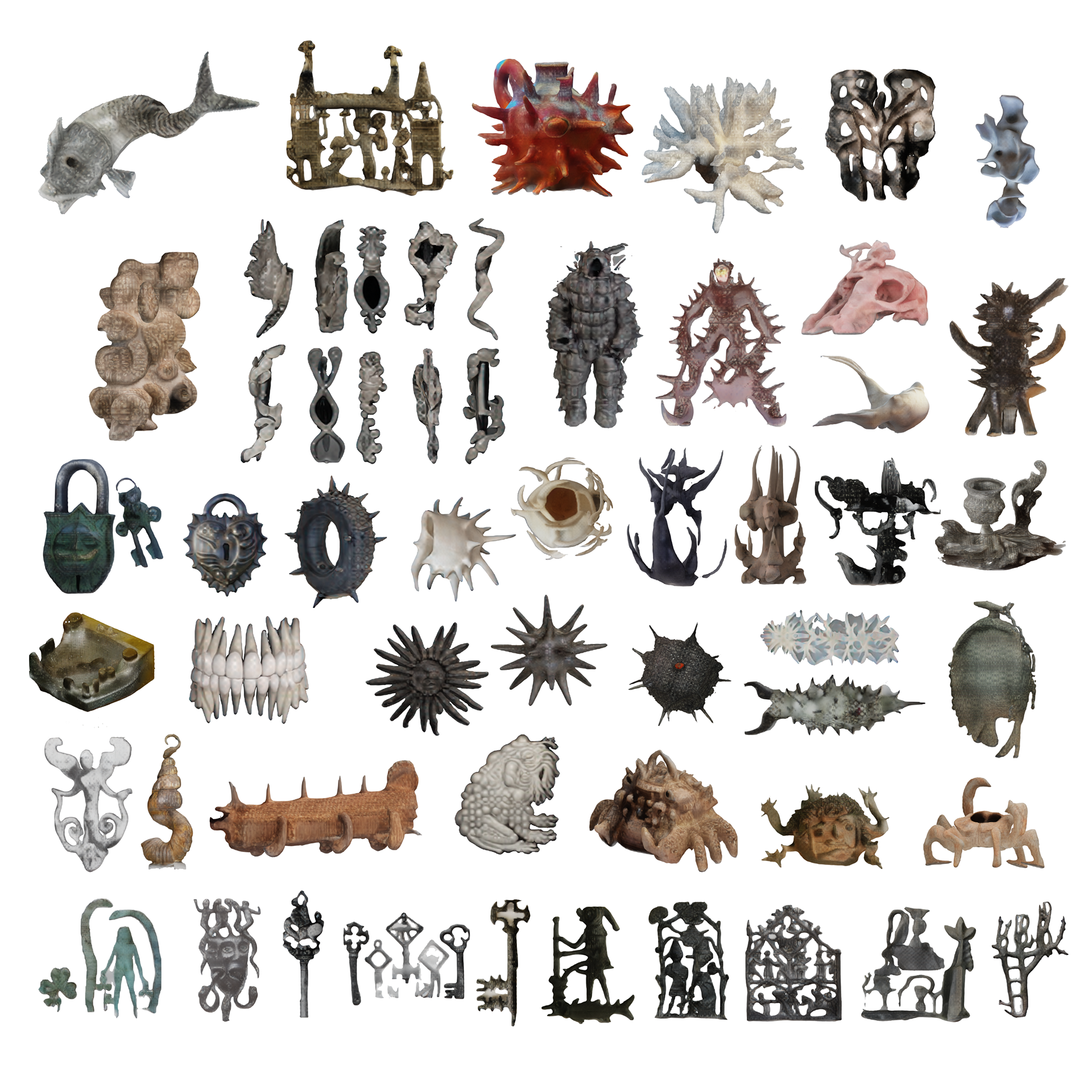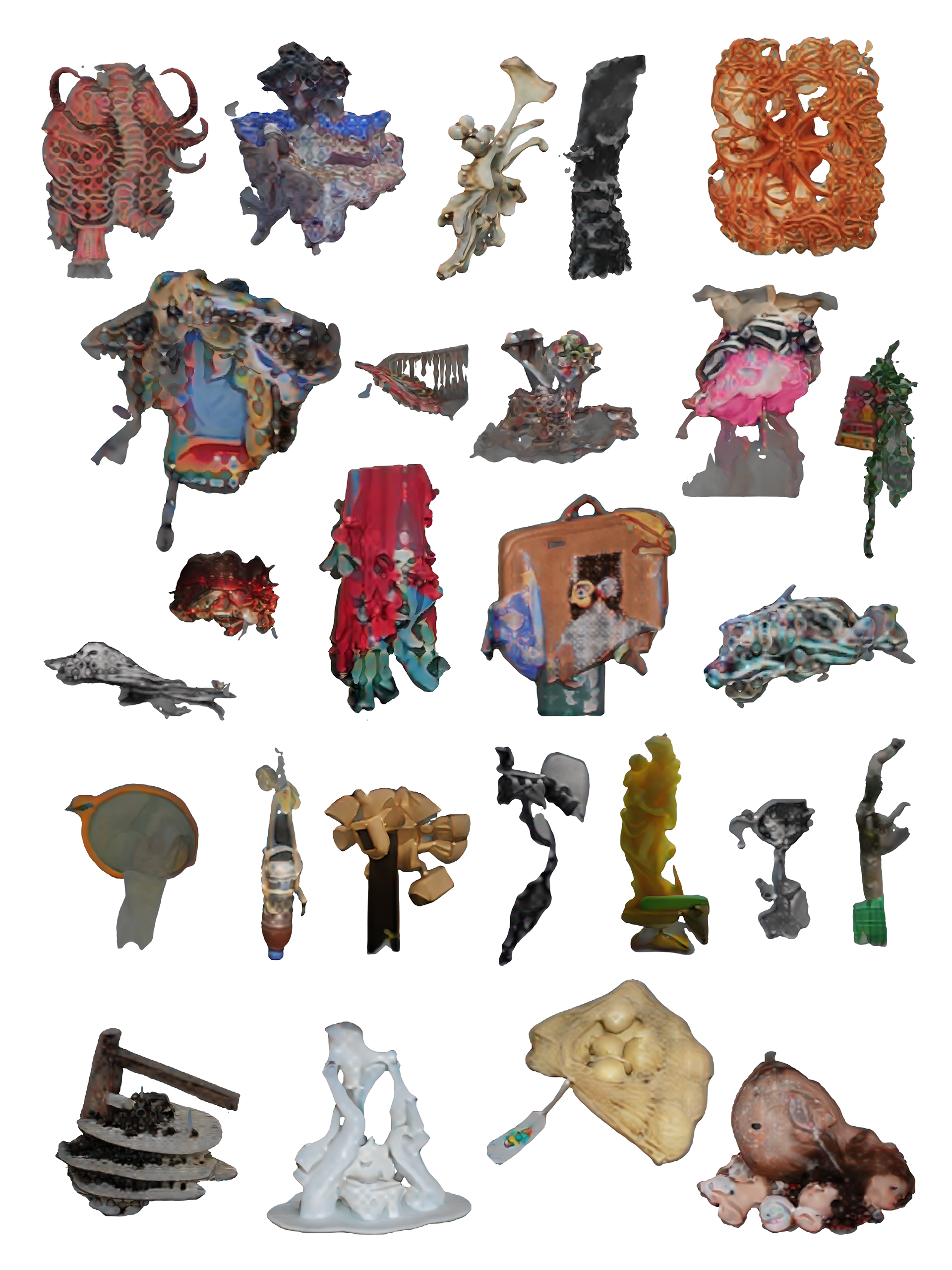 Commencée comme une collection obsessionnelle d’objets 3D, cette pratique s’est progressivement mué en une archive dynamique, mi-inventaire, mi-cabinet de curiosités, où chaque pièce trouve sa place comme le fragment d’un récit plus vaste. Issus d’outils d’intelligence artificielle nourries d’images glanées sur internet et d’archives personnelles, ces objets forment une collection qui se prête à l’exploration : elle propose ses objets à des (dé)réarrangements, des sculptures, et à devenir fragments et acteurs de mondes virtuels dans des histoires encore à imaginer.