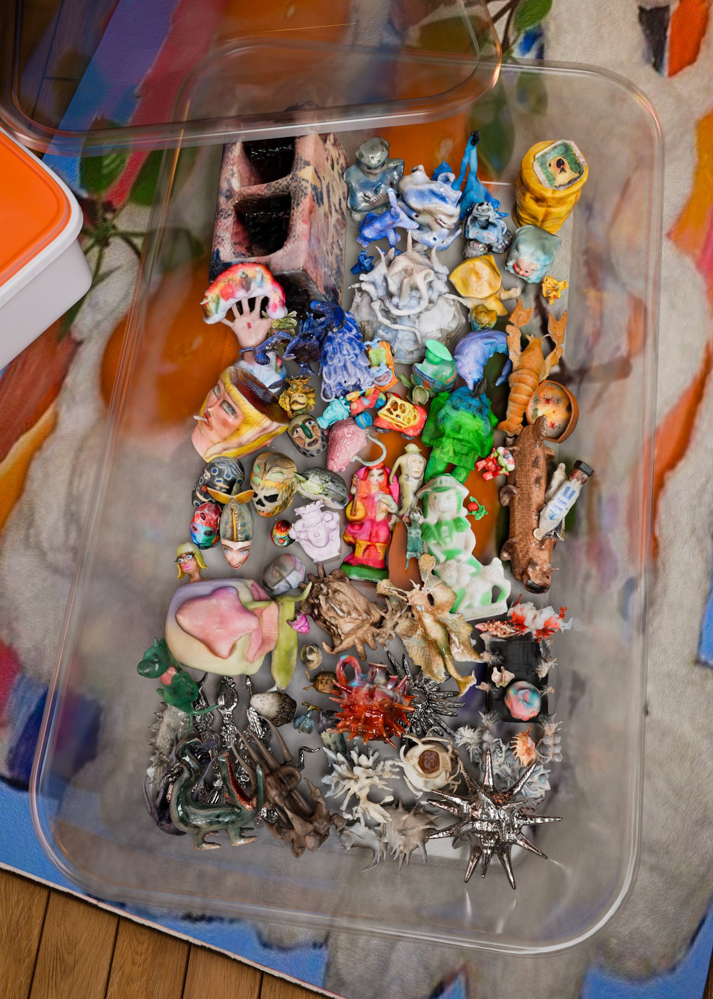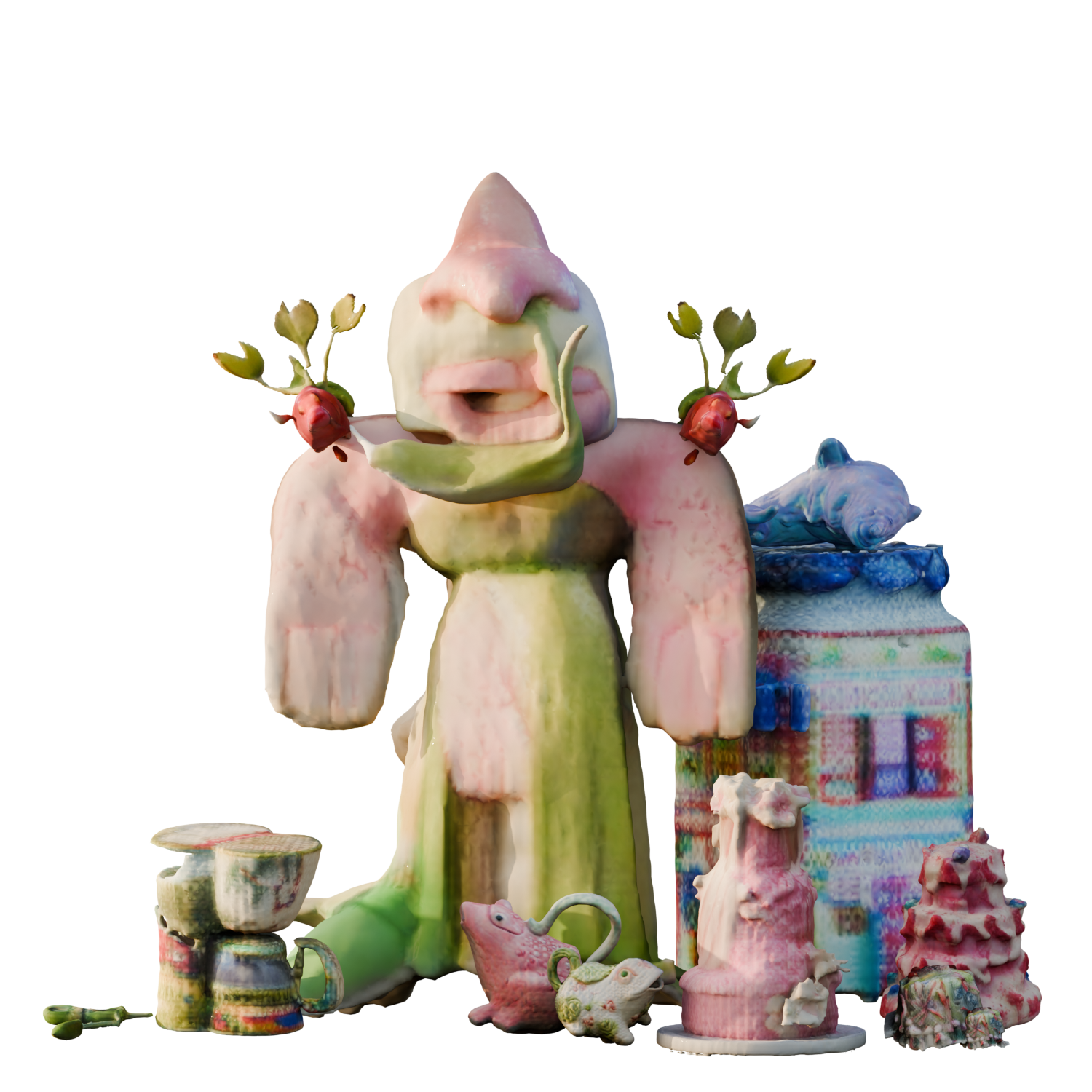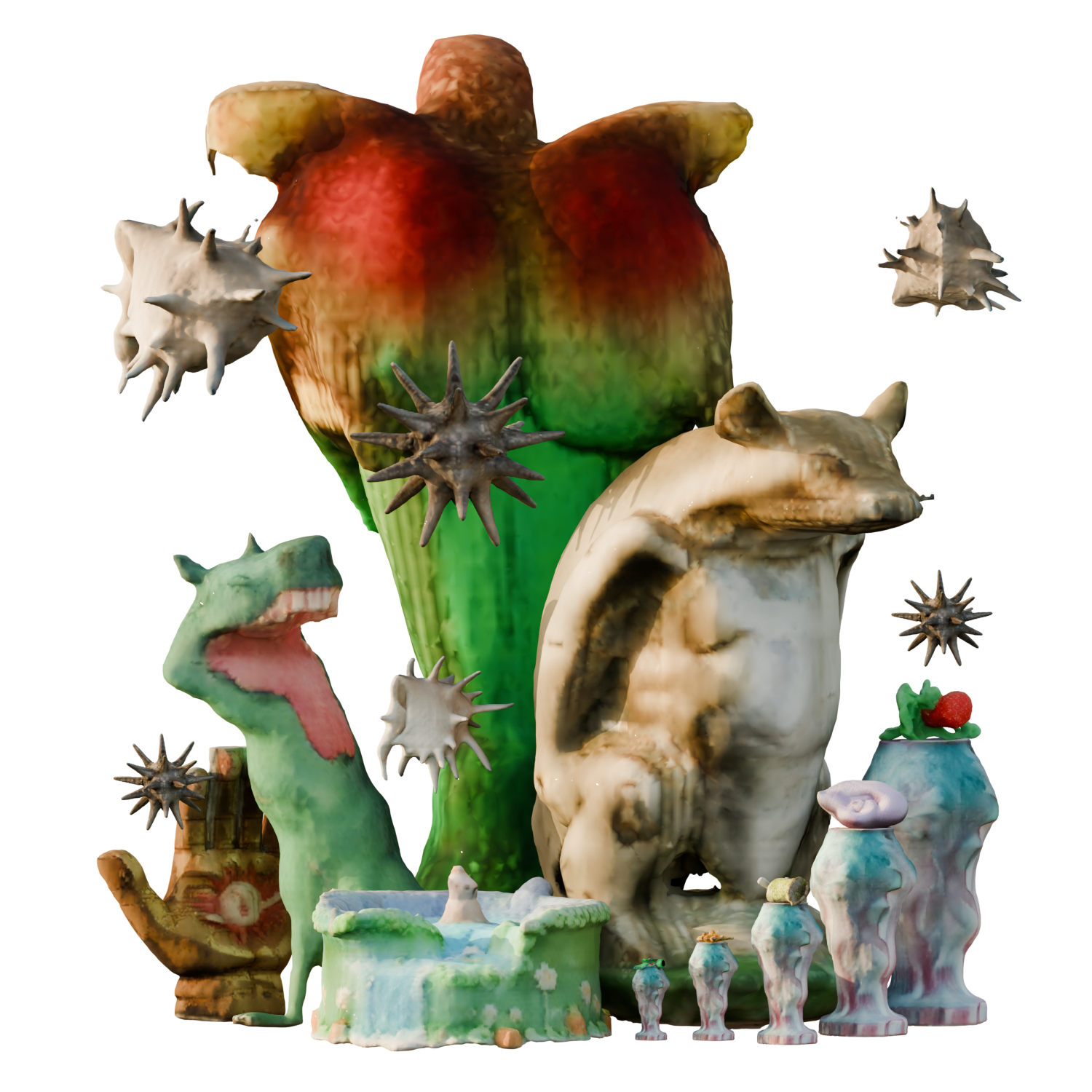 Commencée comme une collection obsessionnelle d’objets 3D, cette pratique s’est progressivement mué en une archive dynamique, mi-inventaire, mi-cabinet de curiosités, où chaque pièce trouve sa place comme le fragment d’un récit plus vaste. Issus d’outils d’intelligence artificielle nourries d’images glanées sur internet et d’archives personnelles, ces objets forment une collection qui se prête à l’exploration : elle propose ses objets à des (dé)réarrangements, des sculptures, et à devenir fragments et acteurs de mondes virtuels dans des histoires encore à imaginer.